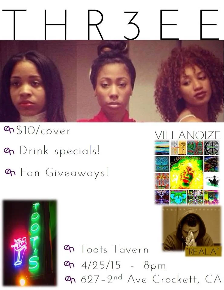 Thr3ee is a girl group from the Bay Area made up of 3 young ladies. Their names are Tamika Rankins, Deborah Ingram and Brittani Fisher. They have been singing together since 2008 and decided to pursue it more seriously in 2012. They have performed at a variety of places throughout the Bay Area and Los Angeles. THR3EE stands for Balance, Equality and Harmony. They utilize every voice to create an array of harmonies. THR3EE as a group is well balanced out as well as equal and every voice is heard. They sing and write their own music, unlike most groups there is no lead singer. THR3EE’s music can be described as alternative R&B with a mix of Soul and Hip Hop. Some of their influences include Tony Toni Tone, Groove Theory, Lauryn Hill, Sade, Jimi Hendrix, The Beatles, Kirk Franklin and Jazmin Sullivan.